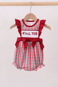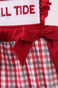 Roll into game day with this spirited Alabama-inspired bubble! Featuring classic crimson and white plaid in a charming smocked ruffle design, this playful piece celebrates your Tide pride in style. The bubble silhouette offers a fun, flattering fit that's perfect for cheering on your team. Whether you're heading to the stadium or showing your colors around town, this adorable top brings that winning spirit wherever you go. Go Bama!