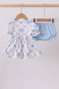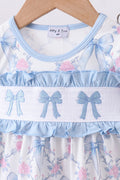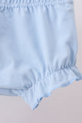 Adorable two-piece set featuring a charming blue bow and delicate floral print. The smocked bodice provides a comfortable, stretchy fit while the ruffled bloomers add a playful touch perfect for little ones. Soft, breathable fabric keeps your child cool and comfortable all day long. Ideal for playdates, casual outings, or cozy days at home. A sweet addition to any wardrobe that combines style with everyday comfort.