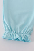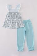 Add a touch of whimsy to your wardrobe with this playful blue bow and lace print ruffle pants set. Featuring delicate lace details and charming ruffles, this set combines comfort with a fun, flirty style perfect for brightening any day.