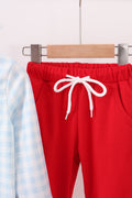Bring a touch of fun to everyday outfits with this Blue Car Embroidery Gingham Pants Set. Featuring charming blue car embroidery atop classic gingham fabric, this playful set combines comfort and style for little ones on the go. Perfect for adding a cheerful vibe to any casual day.