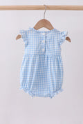 Adorable blue gingham bubble featuring delicate cross bow embroidery and charming ruffles for a whimsical touch. Perfect for adding a pop of personality to any outfit, this playful piece combines classic gingham patterns with sweet embroidered details. Ideal for those who love mixing vintage-inspired style with modern flair. A fun, eye-catching essential that brings joy to your wardrobe.