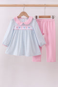 Adorable gingham pants set featuring charming blue heart embroidery details. Perfect for little ones who love sweet, coordinated looks. The classic gingham pattern pairs beautifully with delicate embroidered hearts for a playful, timeless style. Soft and comfortable for everyday wear, this set brings together fun fashion and quality craftsmanship. Ideal for playdates, casual outings, or creating those picture-perfect moments.