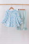 Get your little one holiday-ready with this playful Blue Snowman Christmas Tree Smocked Ruffle Pants Set. Featuring festive snowman and tree designs on a cozy blue fabric, the smocked top adds a snug fit while charming ruffle details bring extra cuteness. Perfect for spreading holiday cheer in style and comfort all season long.