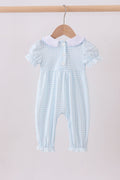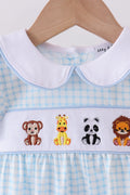 Blue zoo animal embroidery gingham puff sleeve romper