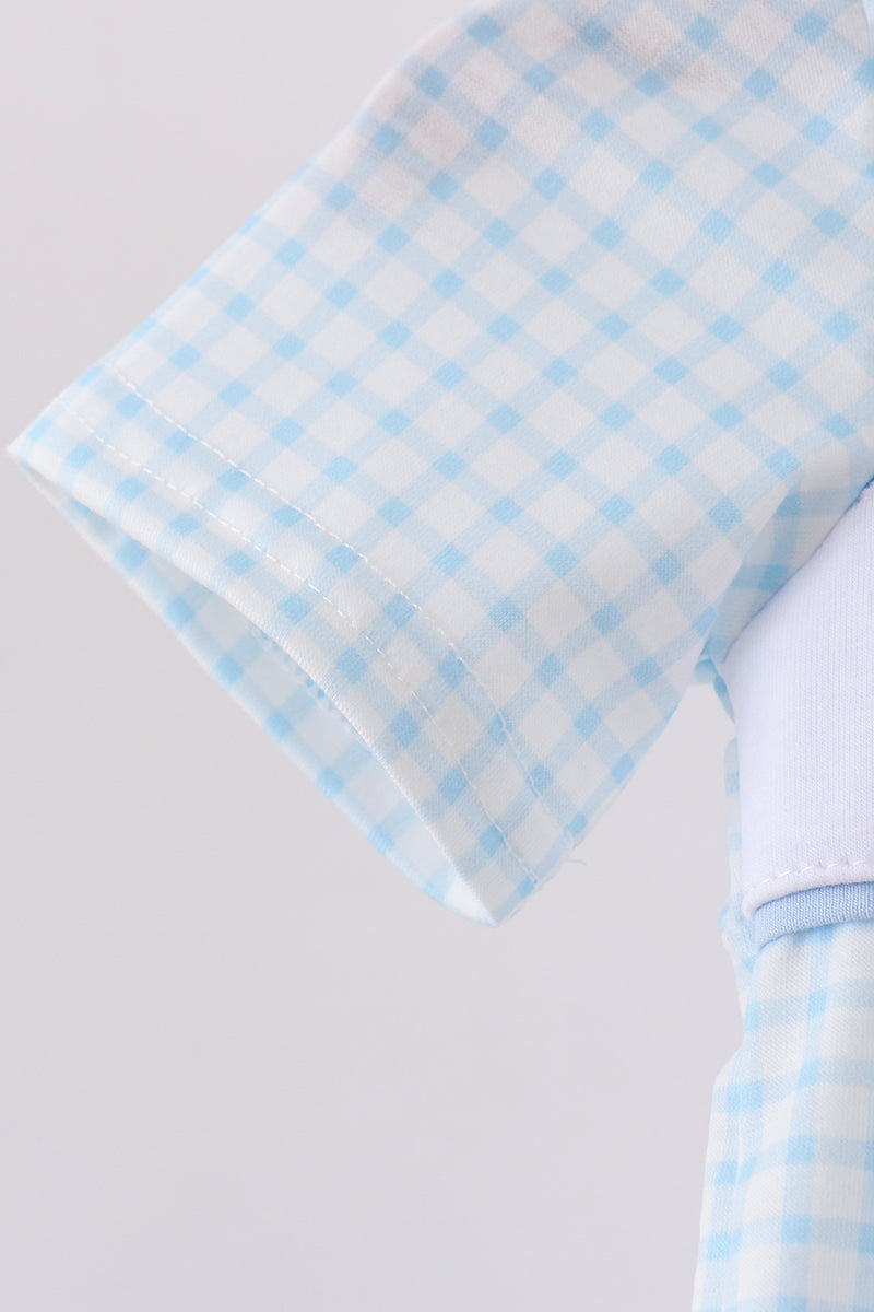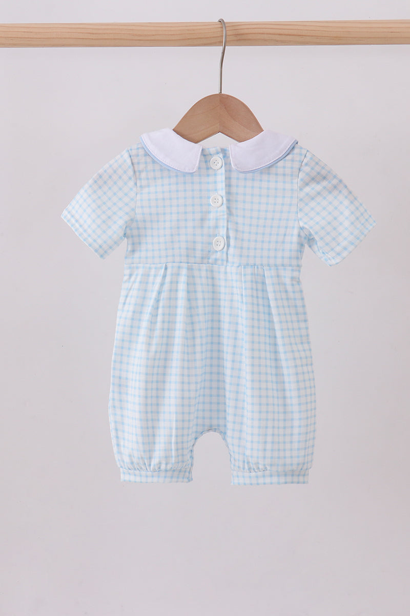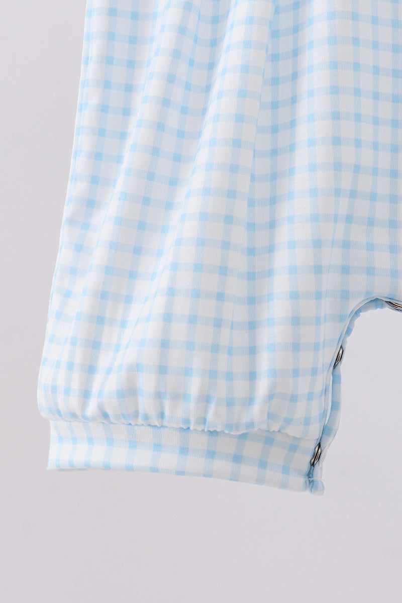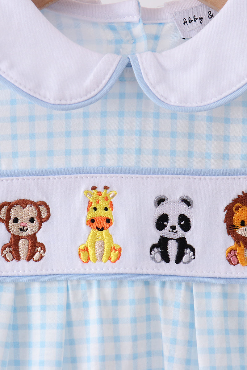 Hop into adorable style with this charming gingham romper! Featuring delightful zoo animal embroidery against a crisp blue and white checked pattern, it's the perfect outfit for little explorers. The playful design brings imagination to life, while the comfortable romper silhouette keeps kids moving freely. Ideal for playdates, casual outings, or making everyday moments extra fun. A wardrobe essential that combines whimsy with practicality!