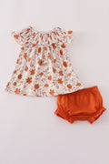 This charming fall floral print smocked bloomer set brings a playful touch to any little one's wardrobe. Featuring a soft, stretchy smocked top and matching bloomers adorned with vibrant autumn blooms, it’s perfect for cozy days and fun adventures. Comfortable and cute, this set makes dressing up a joyful experience for your child.