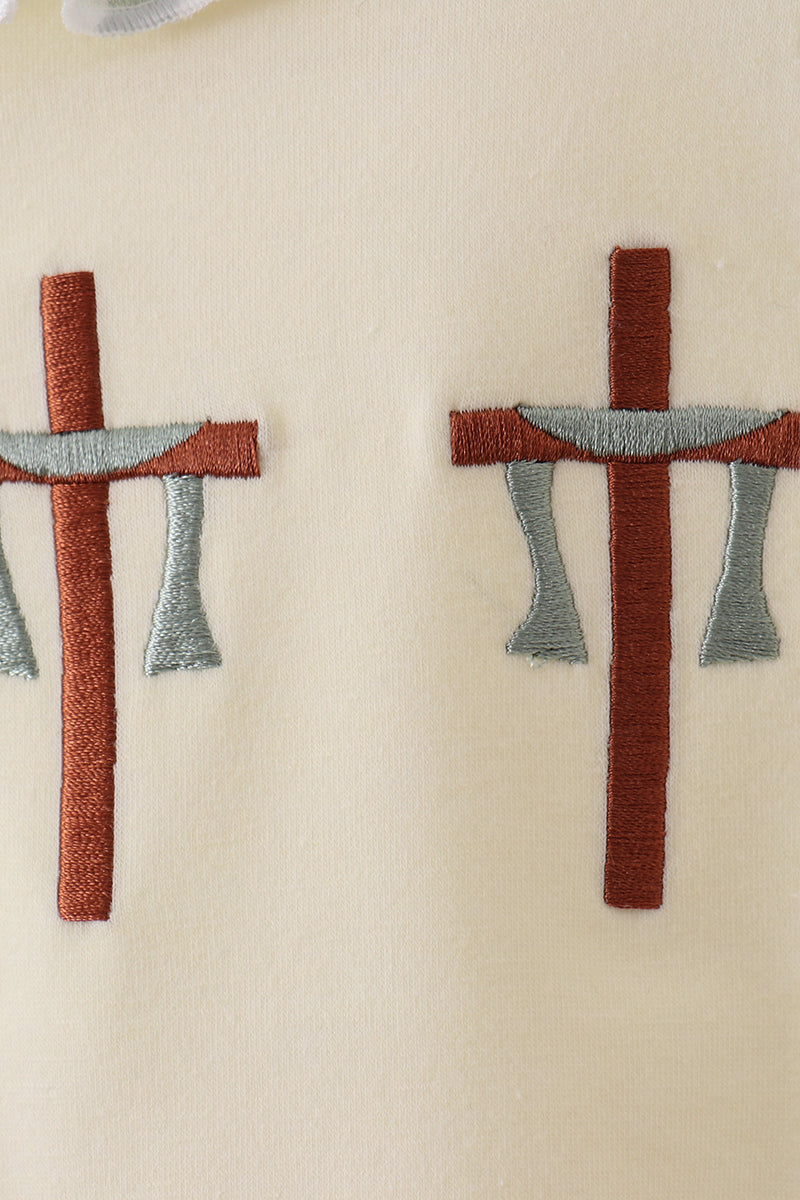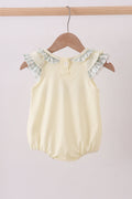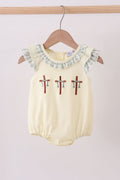Adorable bubble featuring a charming green cross embroidery detail with delicate ruffled edges. Perfect for adding a whimsical touch to any outfit, this playful piece combines sweet vintage-inspired design with modern comfort. The soft ruffle trim frames the embroidered cross beautifully, making it an instant favorite for those who love quirky, eye-catching accessories. Ideal for casual wear or dressing up your everyday look with personality and charm.