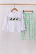 Get ready for festive fun with our Green Grinch Smocked Gingham Pants Set! This playful outfit features charming green gingham fabric paired with a smocked waist for a comfy, snug fit. Perfect for spreading holiday cheer, it combines cozy style with a wink of mischief—just like the Grinch himself. Ideal for joyful occasions or cozy days at home, this set brings a touch of whimsy to every moment.