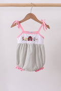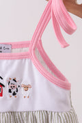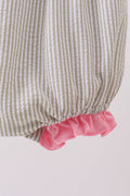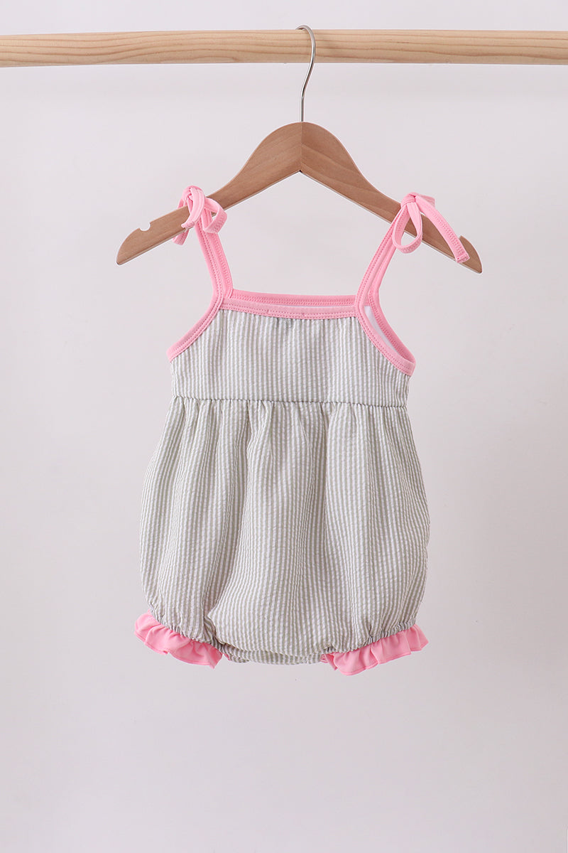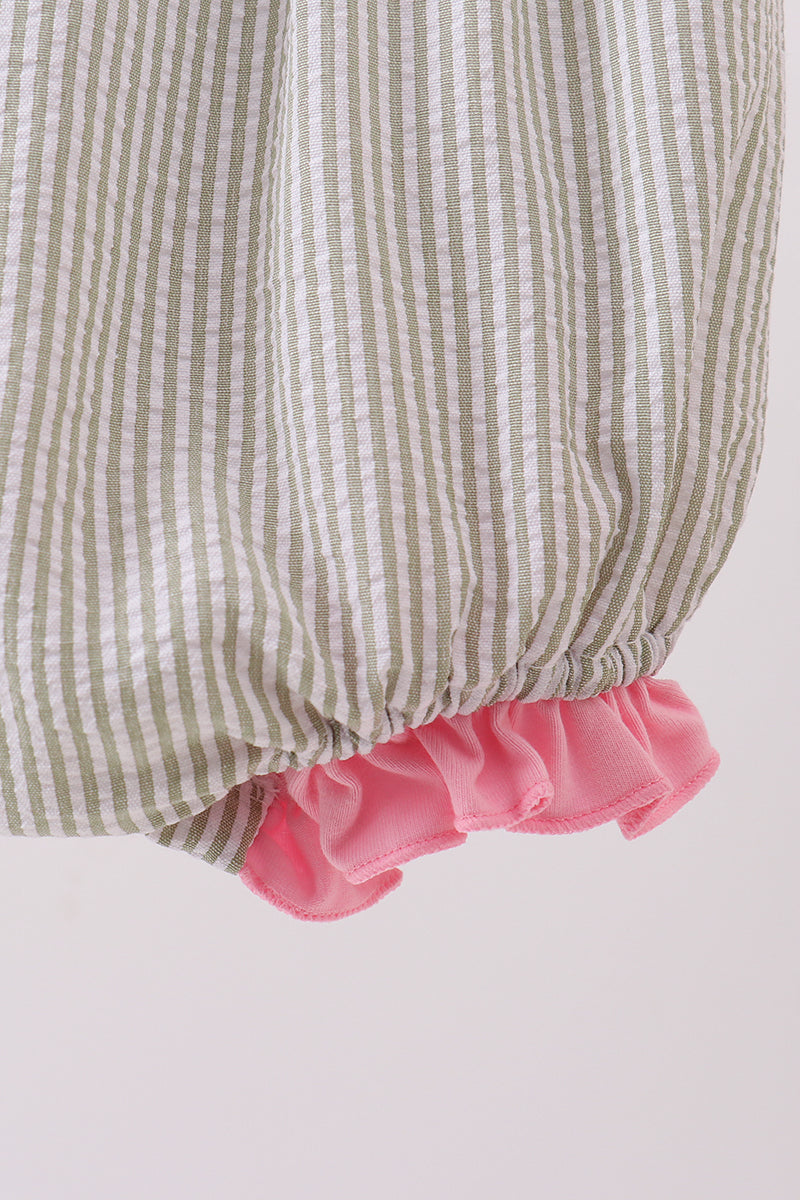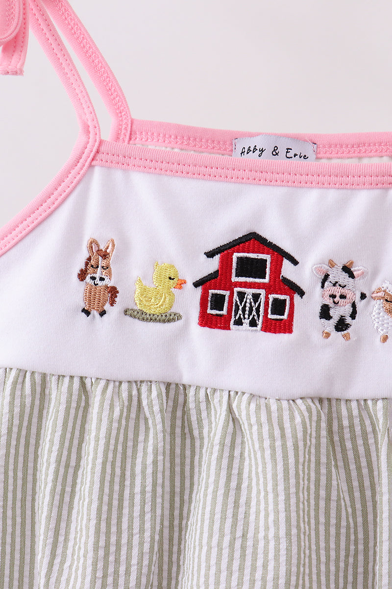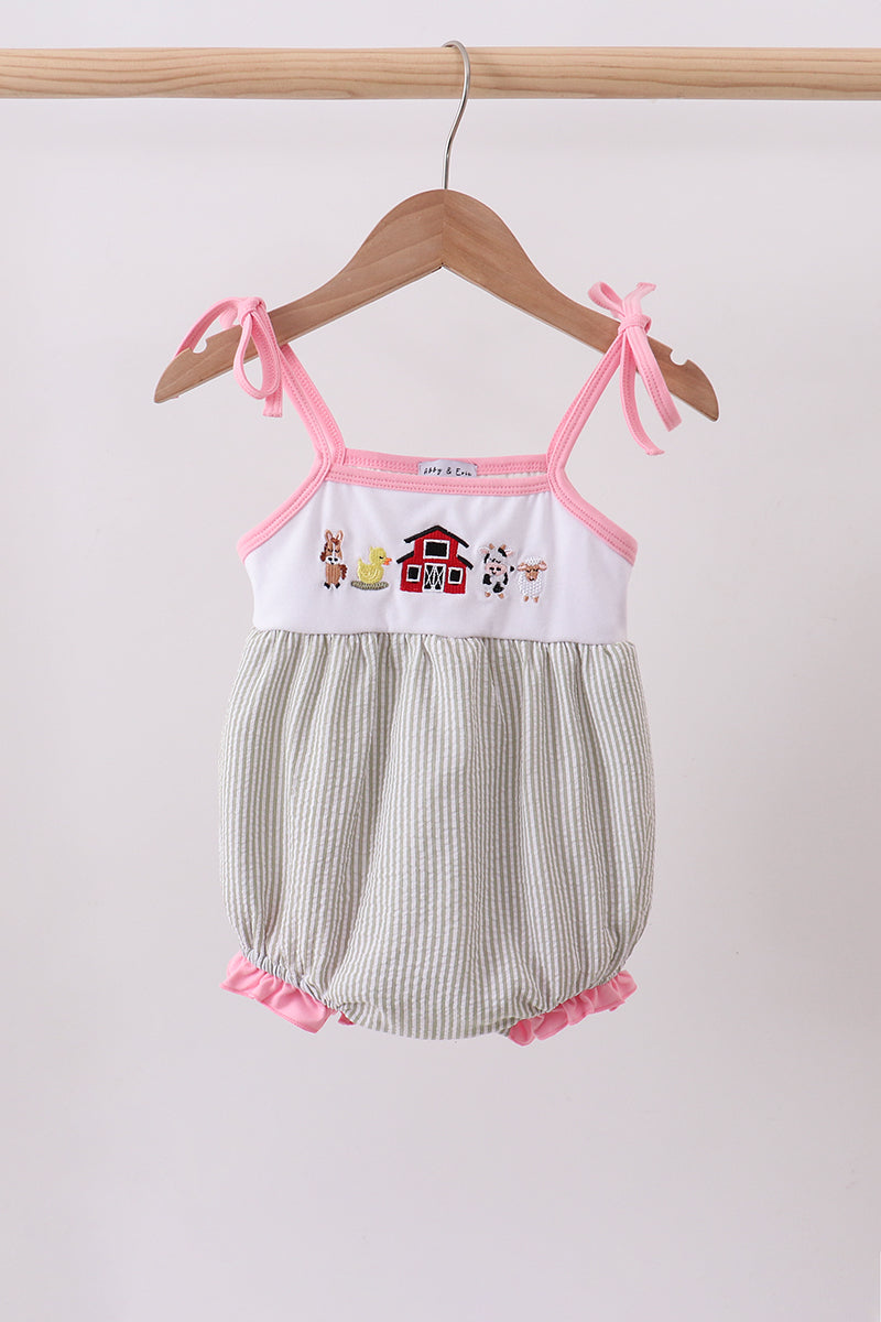Adorable green seersucker bubble featuring charming farm animal designs. Perfect for little ones who love animals and playtime. The classic seersucker fabric offers a soft, textured feel with a timeless appeal. Ideal for warm weather wear, this bubble combines comfort with whimsical style. A delightful addition to any child's wardrobe.