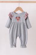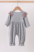 This charming grey romper features a playful reindeer applique and delicate ruffle details, perfect for adding a touch of festive fun to any little one's wardrobe. Soft and comfortable, it’s ideal for holiday gatherings or everyday adventures with a dash of whimsy.