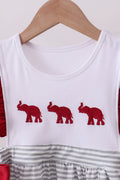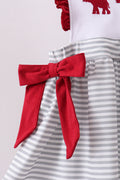 Cheer on your little Crimson Tide fan in style with this adorable maroon set! Featuring classic Alabama embroidery paired with charming stripe detailing and playful ruffle accents on the pants, it's the perfect blend of school spirit and comfort. Whether game day or everyday wear, this coordinated set keeps your kiddo looking cute while showing their team pride. Go Bama!