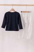 Celebrate the holiday spirit in cozy style with this Navy Christmas Santa Claus Embroidery Stripe Pants Set. Featuring festive Santa embroidery and cheerful stripes, these pants bring playful charm to your loungewear. Perfect for relaxing at home or spreading holiday cheer, the soft fabric ensures comfort while the unique design adds a merry touch to your seasonal wardrobe.