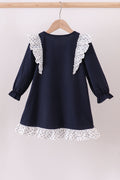 Celebrate the season with this charming navy dress featuring delicate nativity embroidery and playful ruffle details. Its soft fabric and twirl-worthy design make it perfect for festive gatherings and holiday cheer. Dress your little one in joyful style and comfort for memorable moments!