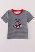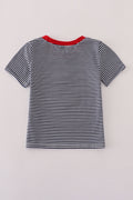 This navy stripe top features a fun racing car embroidery that adds a playful touch to your outfit. Perfect for casual days, it combines sporty style with a dash of whimsy, making it a lively addition to any wardrobe.