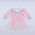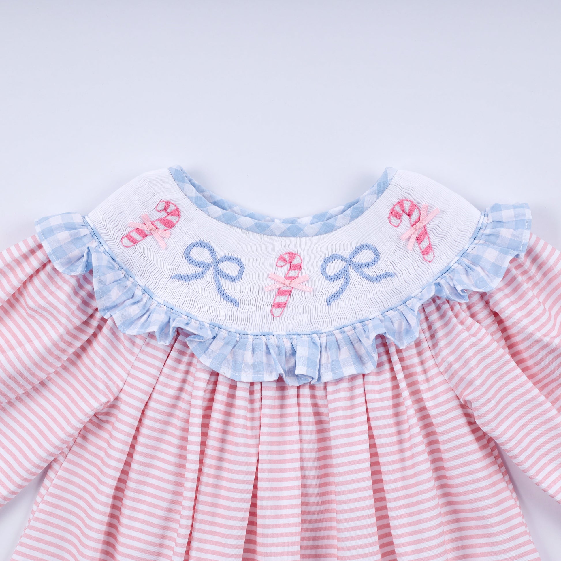 Twirl into sweetness with this delightful pink candy cane bow dress! Hand-smocked details create beautiful texture and movement, while charming ruffles add a playful touch that's perfect for special occasions or everyday fun. The adorable candy cane bow brings festive cheer and whimsical style. Crafted with care, this dress combines comfort with eye-catching design that'll have everyone smiling. A must-have for little fashionistas who love standing out!