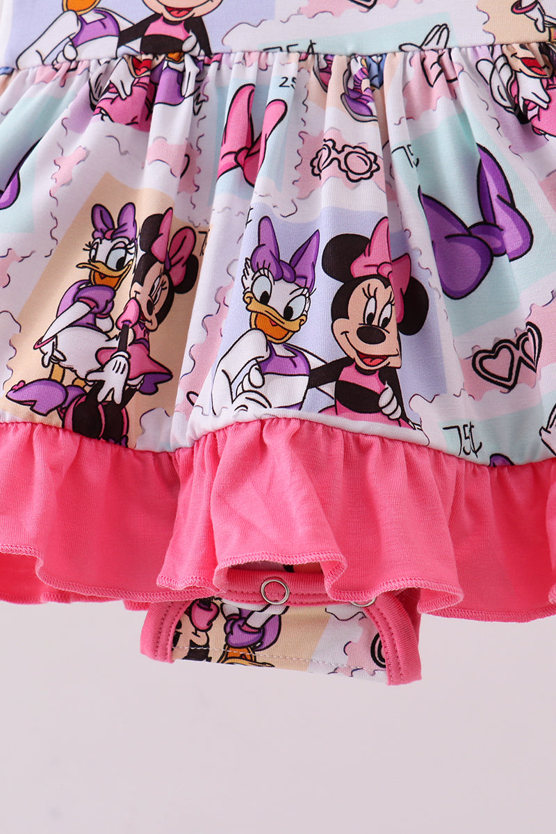 Adorable pink romper featuring beloved character designs and soft bamboo fabric that's gentle on delicate skin. Ruffled details add a whimsical touch perfect for playtime or special occasions. The breathable, eco-friendly bamboo material keeps little ones comfortable all day long. Easy to dress in and machine washable for busy parents. An instant favorite that combines style, comfort, and charm in one precious piece.