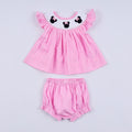 Adorable two-piece set featuring hand-smocked detailing and charming character accents. Soft pink fabric with delicate dot pattern creates a sweet, vintage-inspired look. Ruffled bloomers offer comfortable, playful style perfect for little ones. The smocking adds texture and dimension while maintaining breathable comfort. Ideal for special occasions or everyday wear that makes getting dressed fun and fashionable.