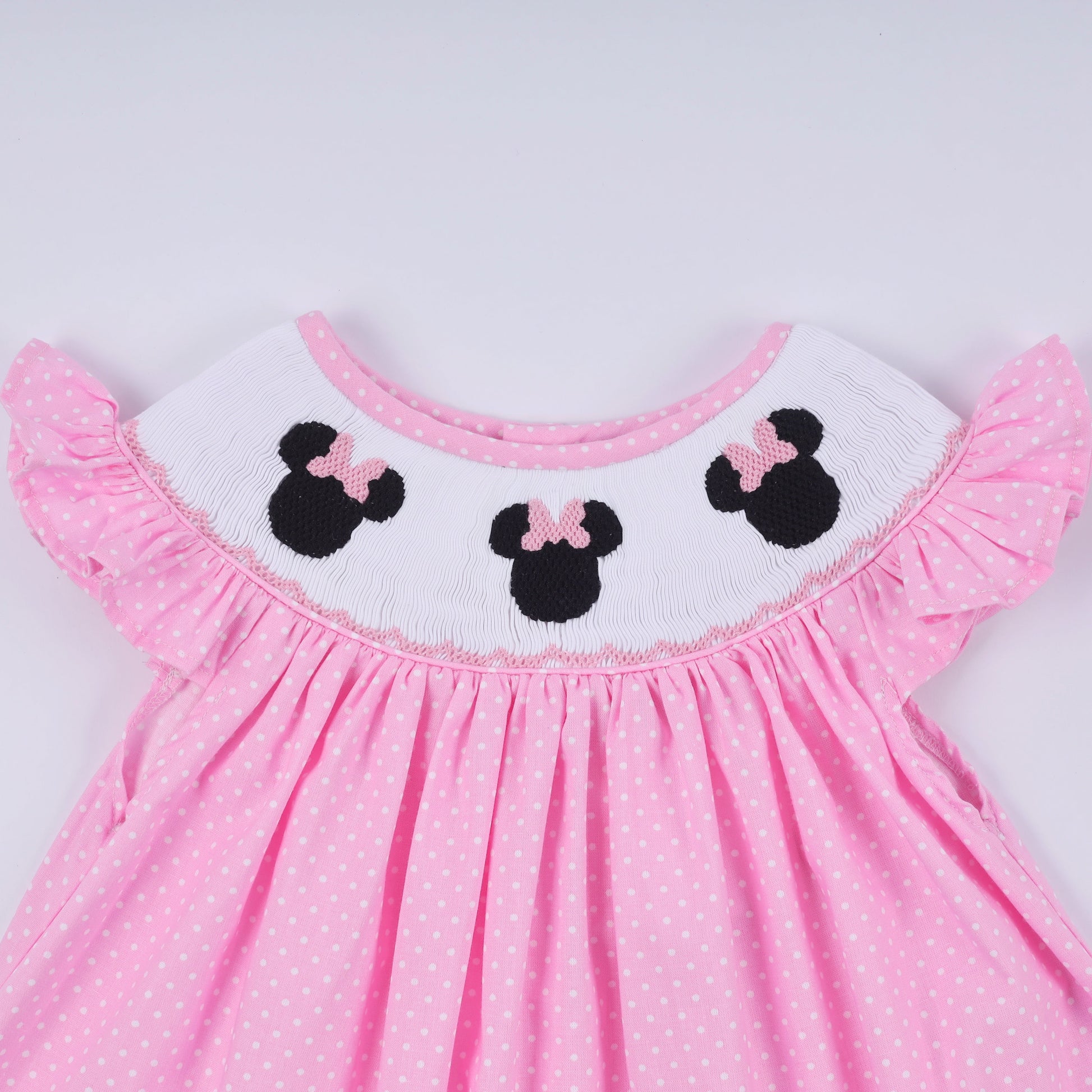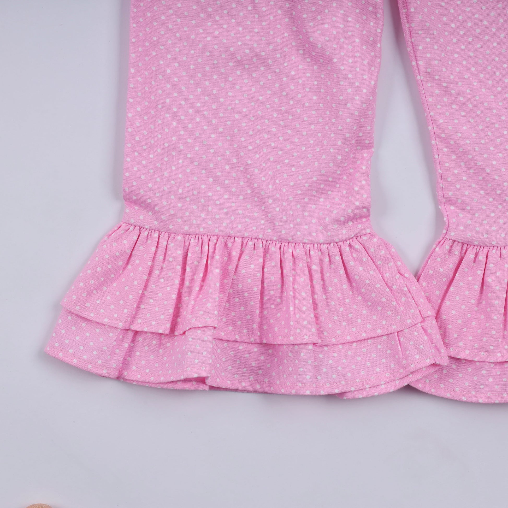 Adorable two-piece set featuring charming character designs with delicate hand-smocked detailing and playful polka dots. The ruffled pants add a whimsical touch perfect for little ones who love standing out. Soft, comfortable fabric makes it ideal for playdates, casual outings, or cozy days at home. A delightful choice for parents seeking quality pieces with personality and charm.