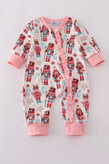 Get festive with this playful pink romper featuring a charming Christmas Nutcracker print. Adorned with delicate ruffles, it adds a touch of whimsy and fun to your holiday wardrobe. Perfect for twirling through the season with comfort and cheer!