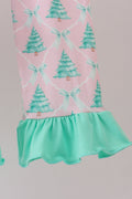 Get cozy and cute this holiday season with our Pink Christmas Tree Ruffle Pajama Set. Featuring playful ruffles and a festive pink hue adorned with charming Christmas tree patterns, this set makes bedtime feel like a celebration. Perfect for lounging or holiday morning fun, it brings a joyful sparkle to your sleepwear collection.