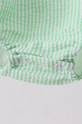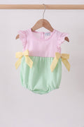 Delicate pink seersucker fabric meets playful design in this charming bubble romper. Flutter trim details frame the neckline and armholes, while ruffled accents add movement and dimension. The classic seersucker weave provides breathable comfort, making it perfect for warm weather wear. Ideal for special occasions or everyday style, this piece combines vintage-inspired details with modern appeal.