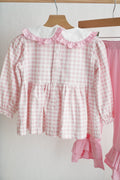 Adorable two-piece set featuring hand-smocked gingham details and charming gingerbread accents. The ruffled pants offer a whimsical touch perfect for little ones who love standing out. Soft pink tones create a sweet, feminine look that's both comfortable and Instagram-worthy. Ideal for special occasions, playdates, or everyday adventures. Mix-and-match pieces let you style them separately for extended wardrobe versatility.