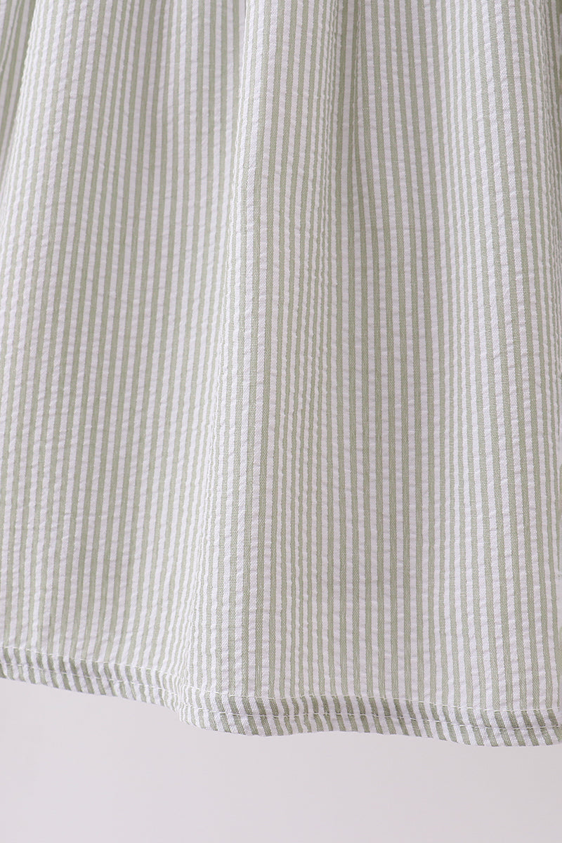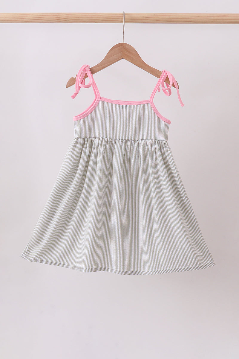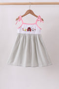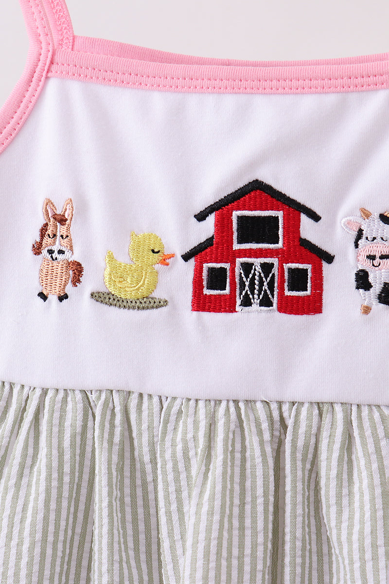 Adorable pink seersucker dress featuring charming farm animal embroidery details. Soft, breathable fabric perfect for warm weather playtime. Delicate ruffles add a playful, feminine touch. Lightweight and comfortable for all-day wear. Ideal for special occasions, family gatherings, or everyday adventures.