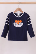 Roar into style with this premium navy top featuring a bold auburn tiger applique that demands attention. Crafted with quality construction, this playful piece brings wild personality to your wardrobe. Perfect for making a statement, whether you're channeling your inner big cat or just want to stand out from the crowd. The striking tiger design adds character and charm to an everyday essential that works as hard as you do.