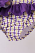 Show your Tiger pride in style with this vibrant purple two-piece swimsuit featuring the iconic "GEAUX" slogan. The smocked bodice offers flattering support and a comfortable fit, while the bold LSU colors make a statement at the pool or beach. Perfect for game day celebrations or everyday wear, this playful set combines school spirit with fun, fashionable design. Go Tigers!