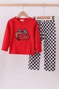 Red character applique checkered pants set