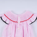 Meet the dress that's as fun as playtime itself! This charming bubble features a classic red plaid pattern with delightful hand-smocked detailing that adds texture and visual interest. The character design brings personality to every wear, while ruffled accents frame the neckline and sleeves for an extra touch of whimsy. Perfect for little ones who love standing out, this playful piece combines timeless smocking craftsmanship with modern character appeal. Comfortable, cheerful, and undeniably adorable—it's the kind of dress that makes getting dressed an adventure.