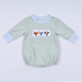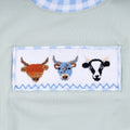 Adorable hand-smocked bubble featuring a charming cow design in soft sage tones. This whimsical piece combines traditional smocking techniques with a playful aesthetic, perfect for little ones who love farm-inspired fashion. The bubble silhouette offers comfortable movement and a timeless look that works for any occasion. Crafted with care and attention to detail, it's a delightful addition to any child's wardrobe.