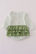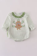 This charming sage bubble romper features a playful turkey applique and delicate stripe ruffle details, perfect for adding a touch of whimsy to your little one’s wardrobe. Soft and comfy, it’s designed for easy movement and endless fun. Ideal for festive occasions or everyday adventures!