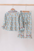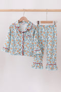Get cozy and festive in this playful Santa Claus cookie print ruffle pajama set. Soft fabric keeps you comfy all night, while cheerful holiday designs and charming ruffle details add a fun, whimsical touch to your sleepwear. Perfect for holiday mornings or cozy nights by the fire!